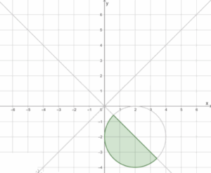 Первая часть неравенства: \( (x — 2)^2 + (y + 2)^2 \leq 4 \) — это уравнение окружности с центром в точке \( (2, -2) \) и радиусом 2.